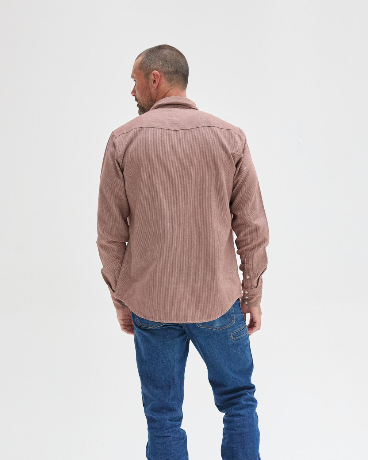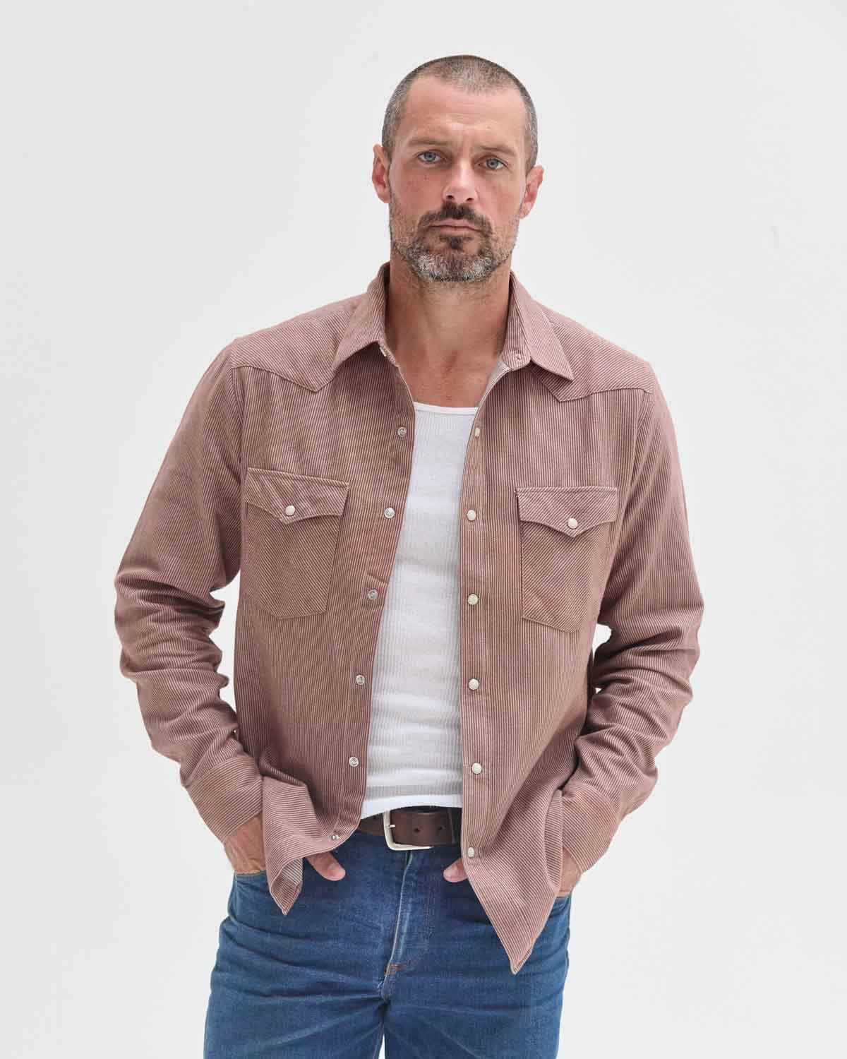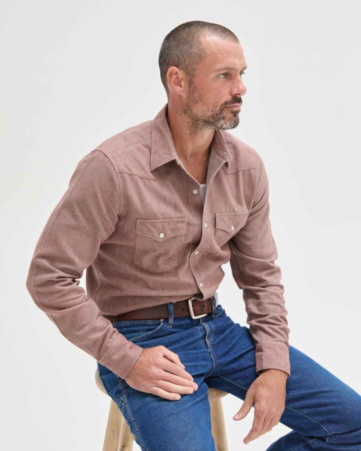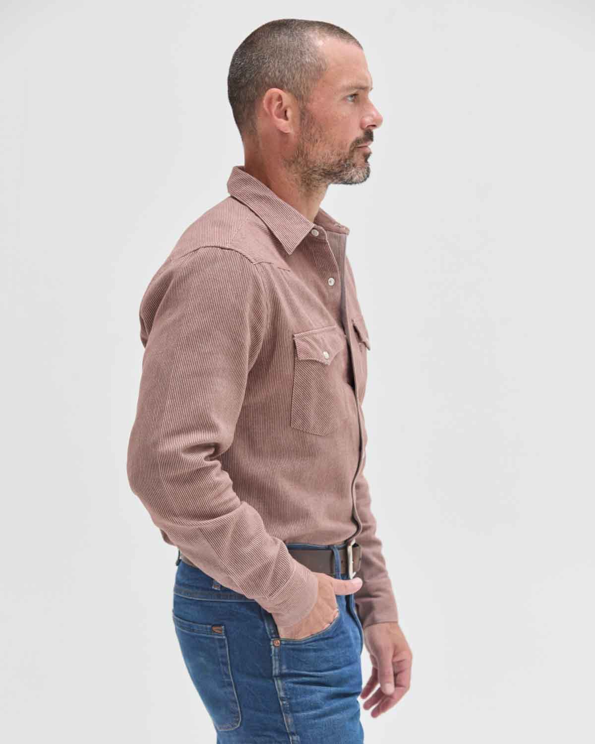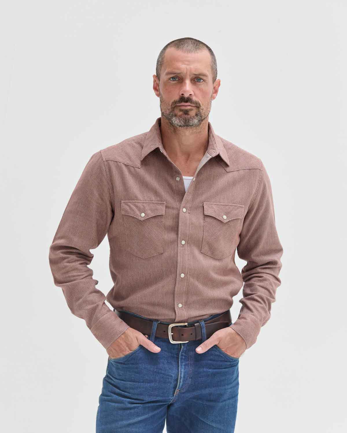 Red clay brushed flannel with off-white vertical stripes sewn into it. It's subtle, soft and easy - with just enough texture.